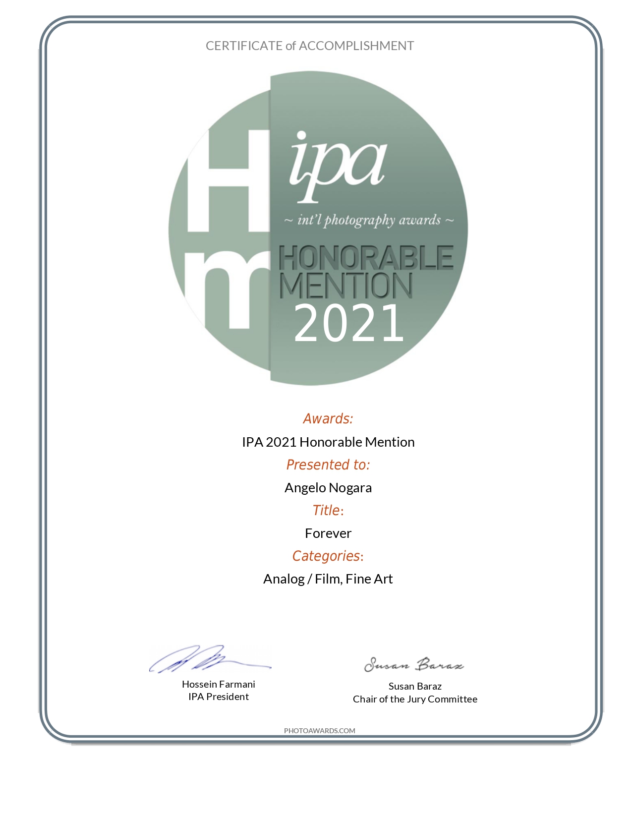 Angelo Nogara’s picture “Forever” has been awarded an Honorable Mention in the 2021 edition of the IPA International Photography Awards, category FINE ART/ Analogic.